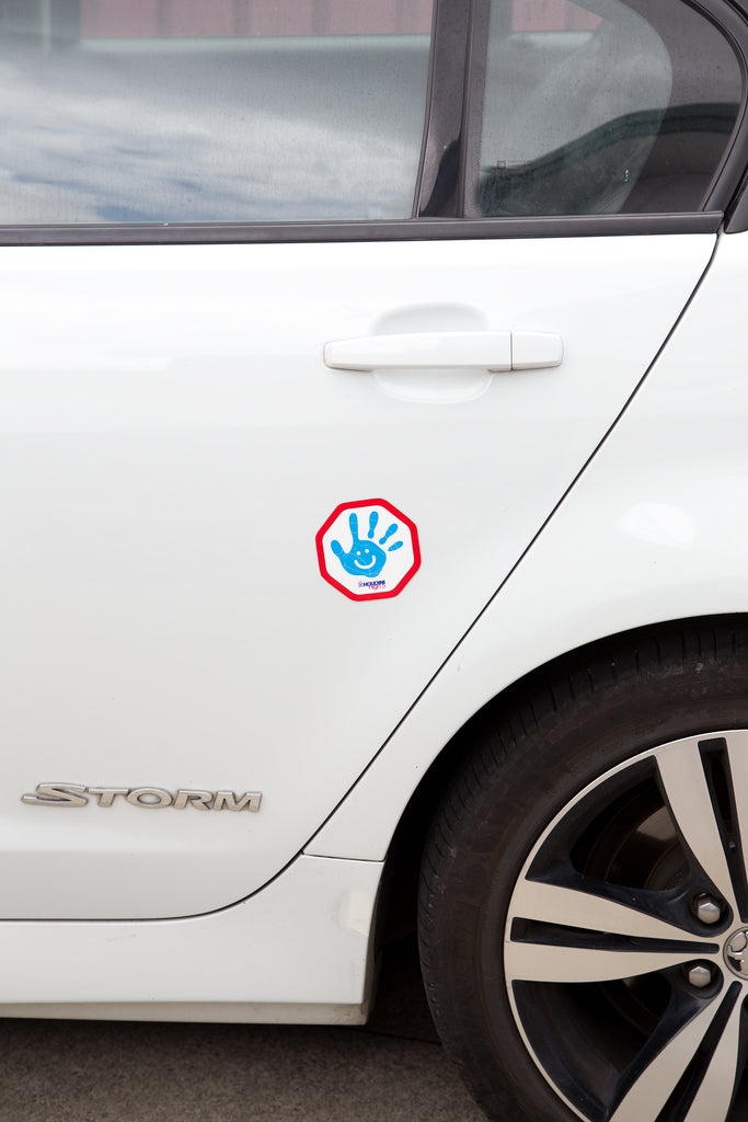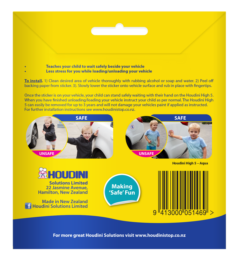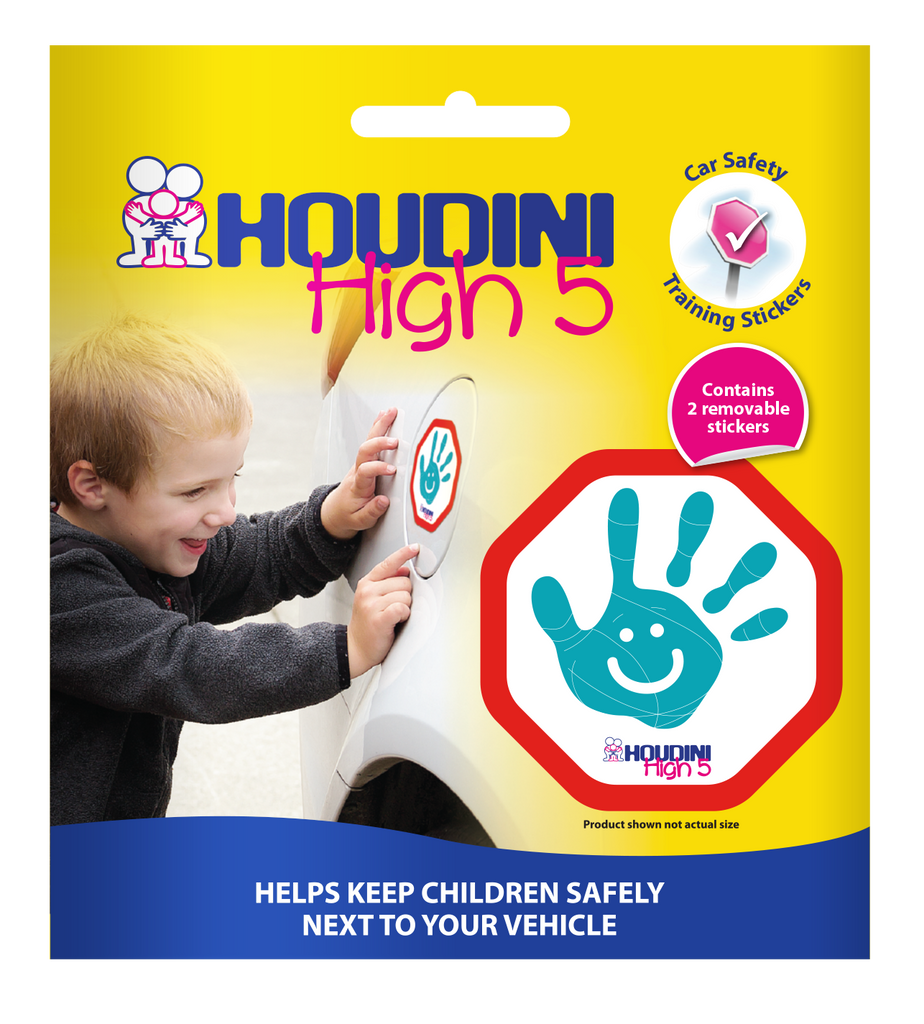 Houdini High 5 teaches your child to wait safely beside your vehicle. It gives them a fun job to find the hand when they get out, allowing parents to remove other children and items from the car which means less stress for you.