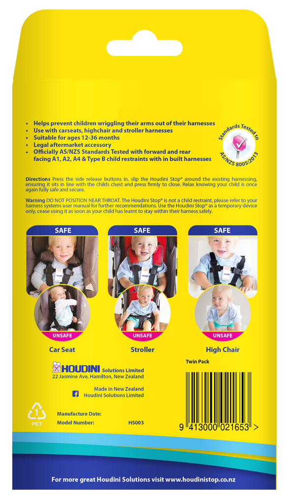 Legality: The Houdini Stop has been officially crash-tested and reviewed by ACRI (Australasian Crashworthy Research Centre). It is legally allowed to be purchased as an accessory and used on a wide range of harnesses. It is considered an aftermarket product, and parents or caregivers can decide whether or not to use it with their child.